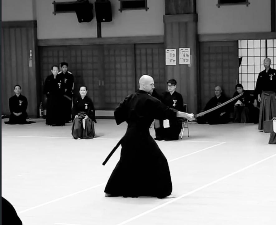 A katana is generally a two handed weapon. I am now at the point where I can swing my sword one handed and still produce a blade sound on the swing. While warming up recently I noticed my new 後輩 (kohai : junior) watching me and then trying to imitate my movements. Unfortunately and frustratingly with less noisy results.