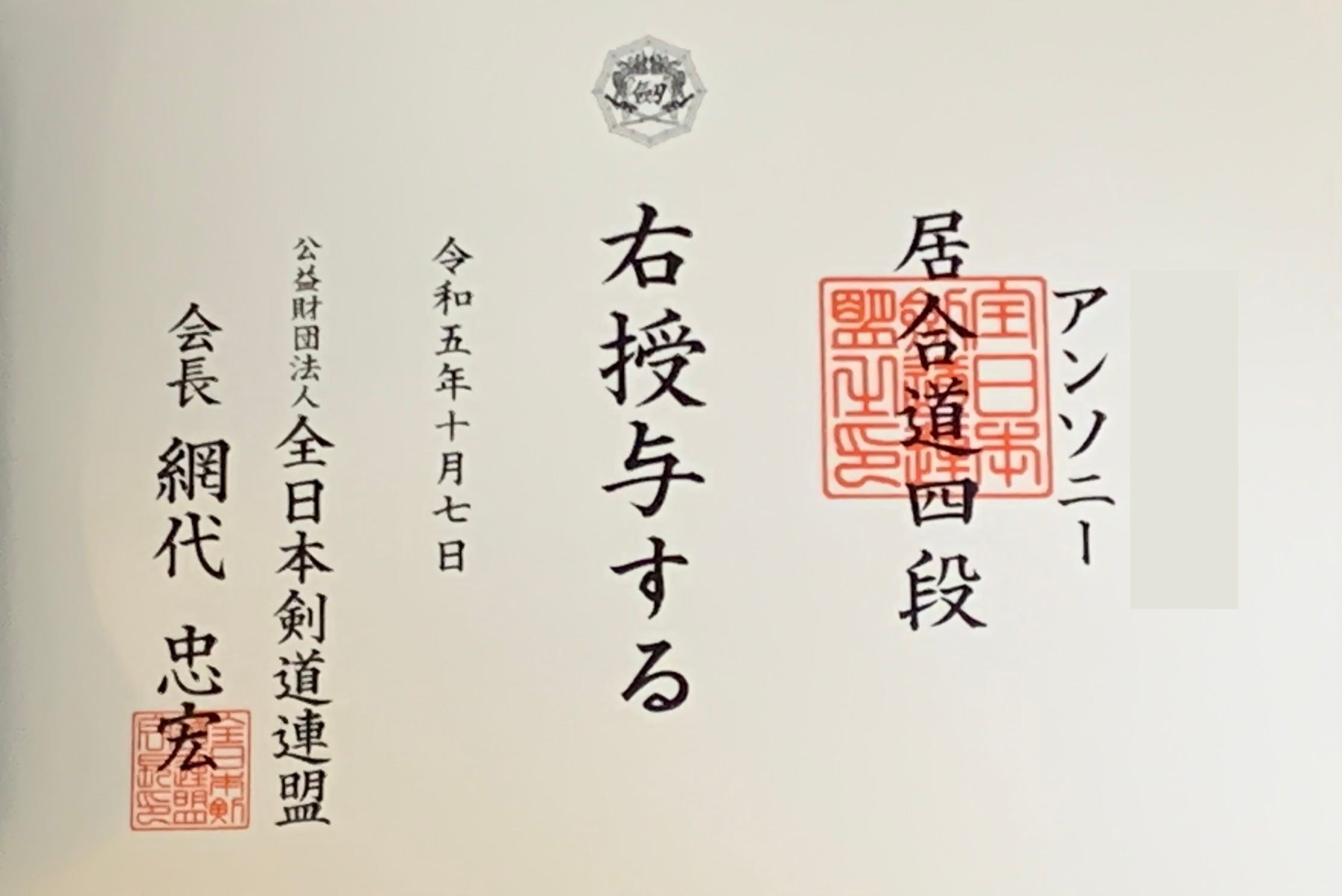 Back in October 2023 I passed my 4th dan in iaidō with the All Japan Kendo Federation. It took a while for the certificate to arrive (it finally arriving in January 2024). For my readers who have not seen a certificate of rank in Japanese before, you can see mine below (note that I redacted my family name on the right):