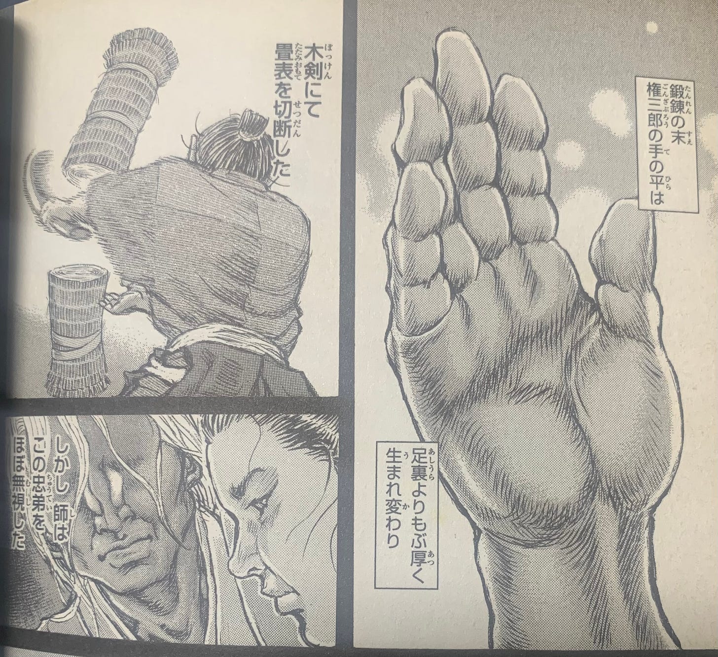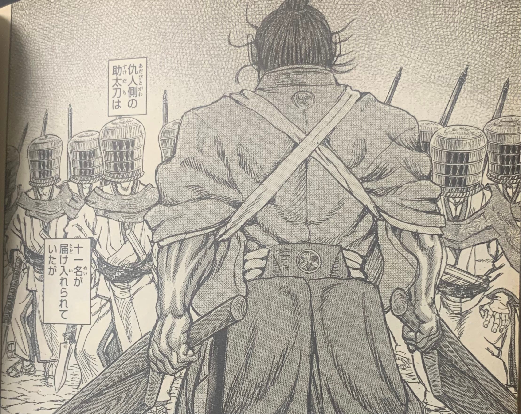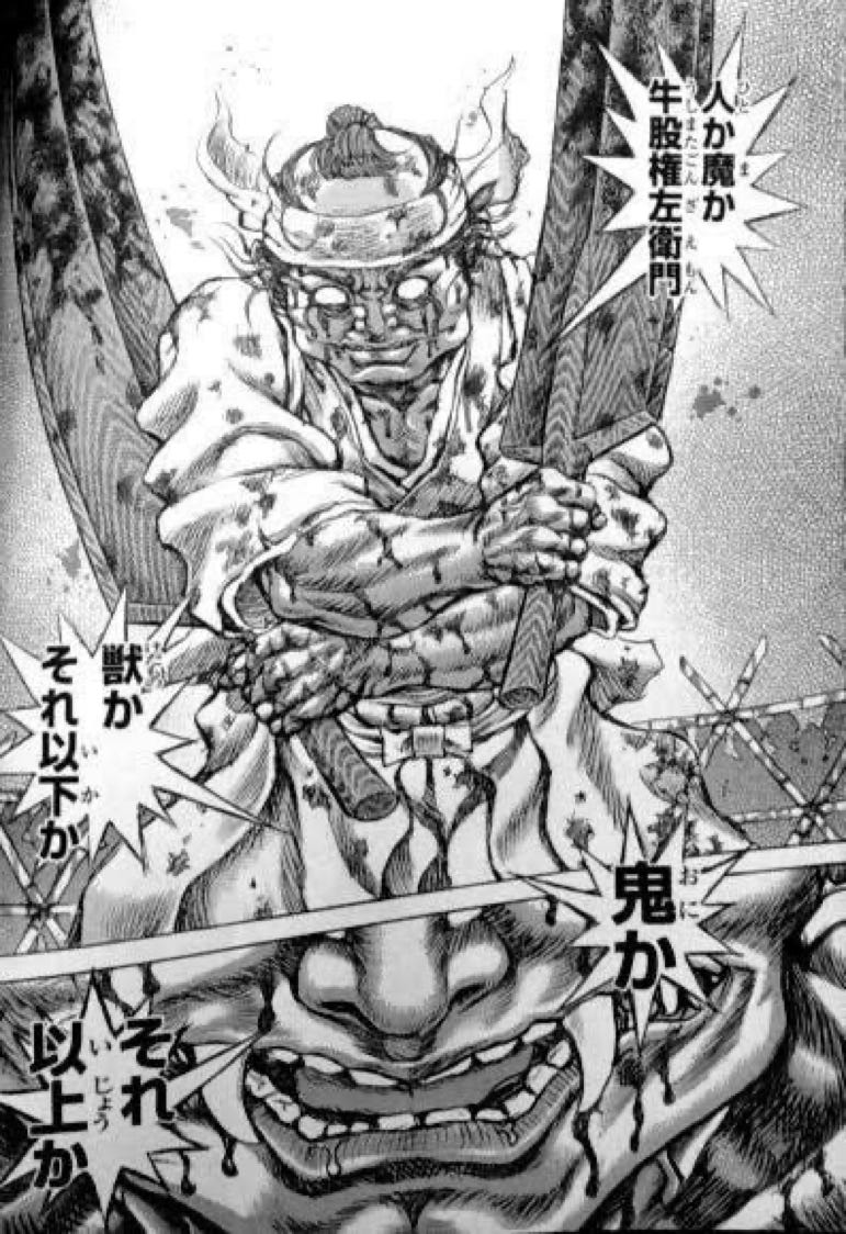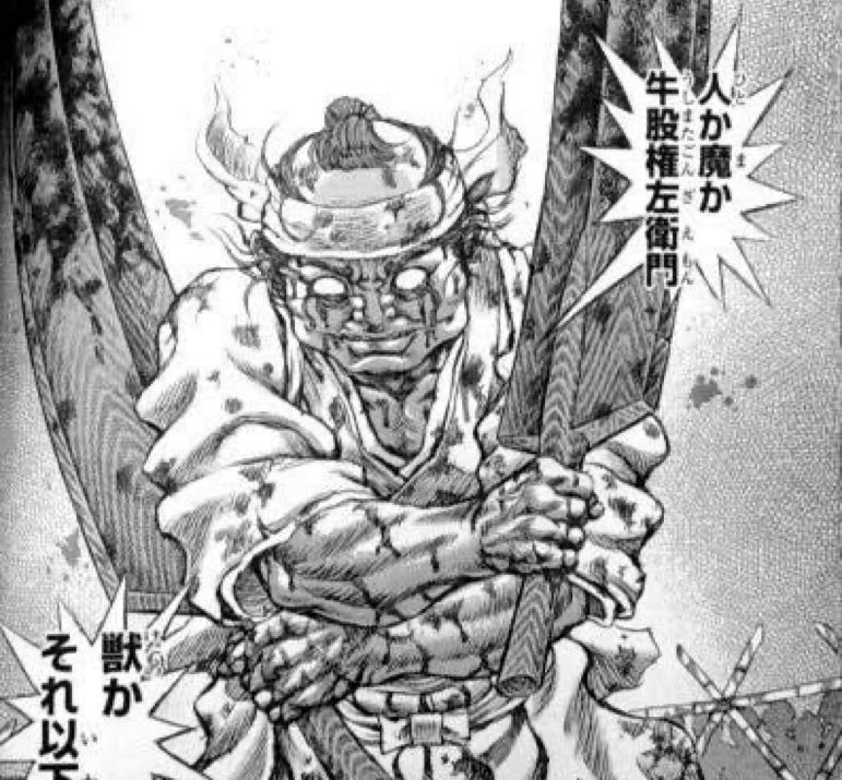 牛股権左衛門 (Ushimata Gonzaemon) is an absolute hulk of a man. He is introduced in the story as one of the instructors of the 虎眼流 (Kogan Ryu) style who can dual wield huge wooden swords (かじき : Kajiki) as if they are regular swords. The headmaster of the style, 岩本虎眼 (Iwamoto Kogan) cuts Ushimata’s mouth into a wide smile when not getting a straight answer about which of the students has the strongest “seed.” (Kogan only had one daughter and no sons, and was obsessed with the thought of having a grandson to continue his legacy).