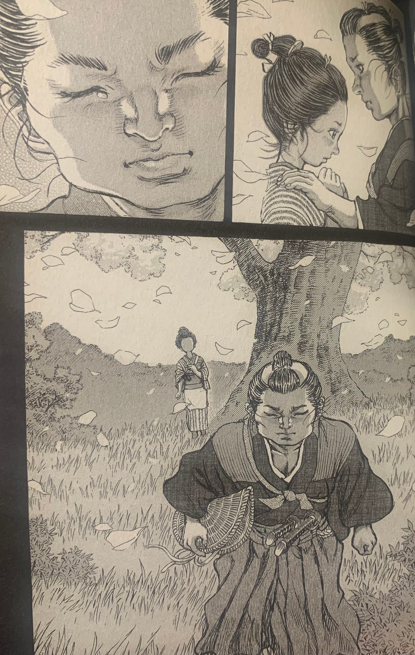 At one point the story cuts back to Ushimata as a youth when he was called 牛股権三郎 (Ushimata Gonzaburō). He is speaking to a girl called ふく(Fuku) under a cherry blossom. Fuku is the girl he is betrothed to marry when he comes of age. He promises her, “In three years I will return and I will stand before you as a swordsman.” He then sets off to learn the way of the sword.