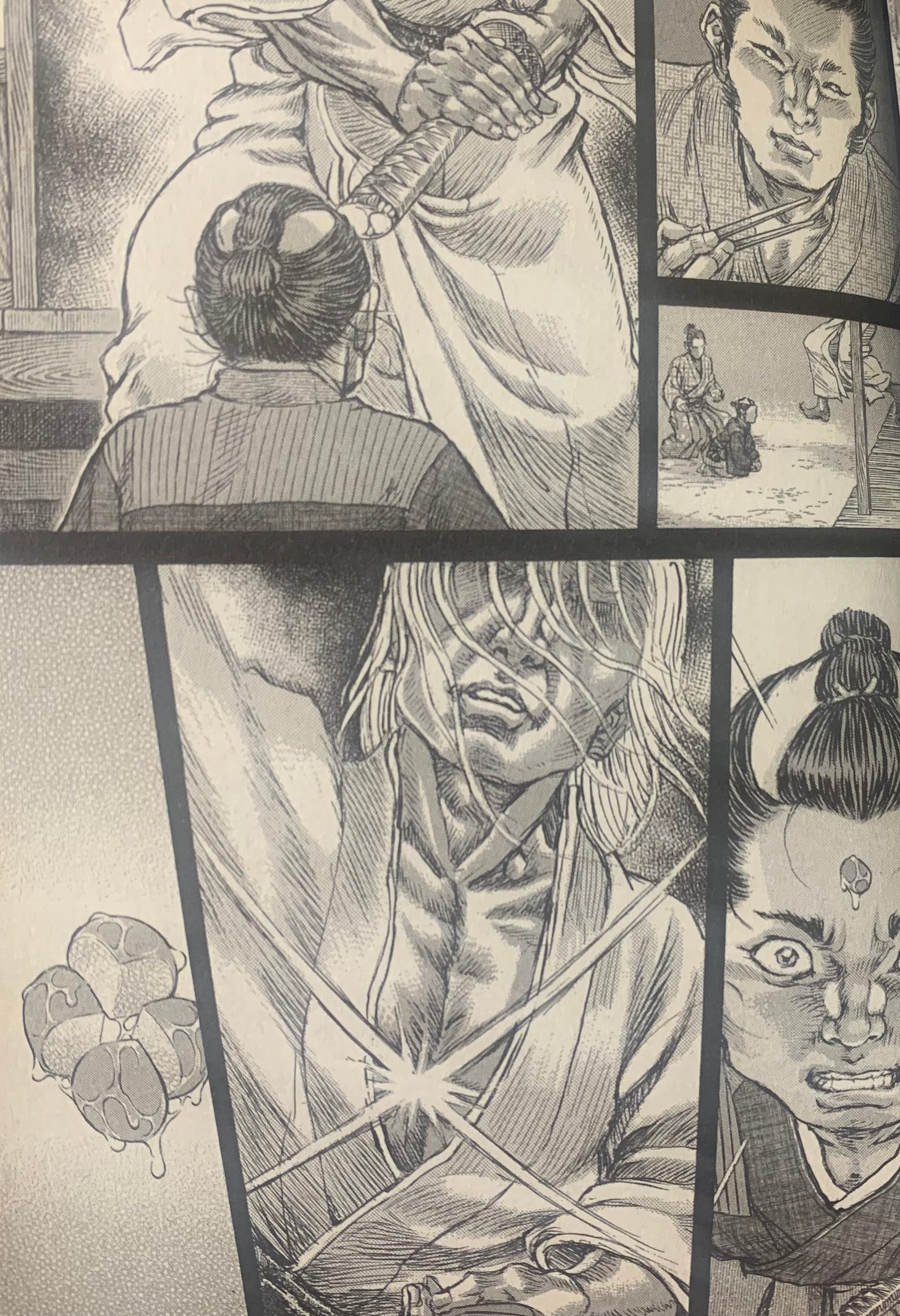 There are a lot of layers to Ushimata’s story. He begins with a promise to his love that he would see her again in three years as a swordsman. He is one year late when he meets her again, but the next time he sees her, he is a swordsman. Better late than never? I’d like to think he made the promise originally because he loved Fuku and because she was more important to him than anything else in the world. But after becoming obsessed with the thought of being the greatest swordsman he could possibly be, he lost sight of his original promise and fully dedicated himself to something else. Killing Fuku would probably have satisfied Kogan that he dedicated himself to the style, but as a final act of defiance(?) he castrates himself to keep his vow to Fuku. (If he could not be with Fuku, he would be with no other woman).